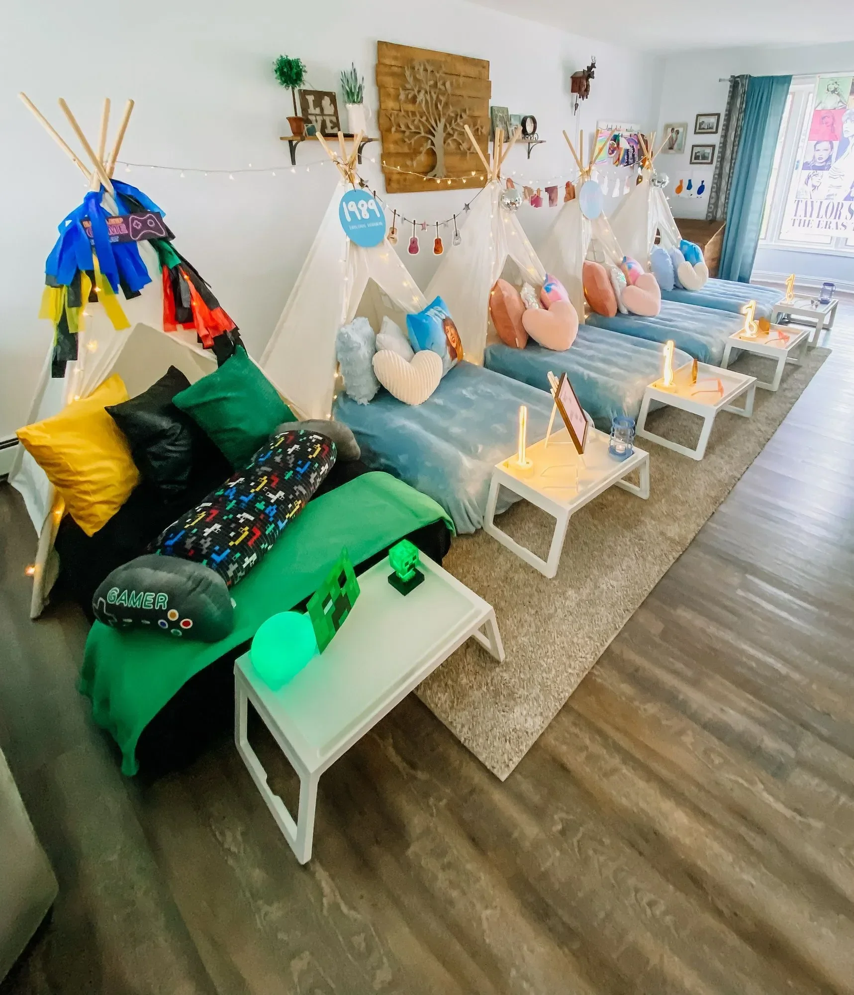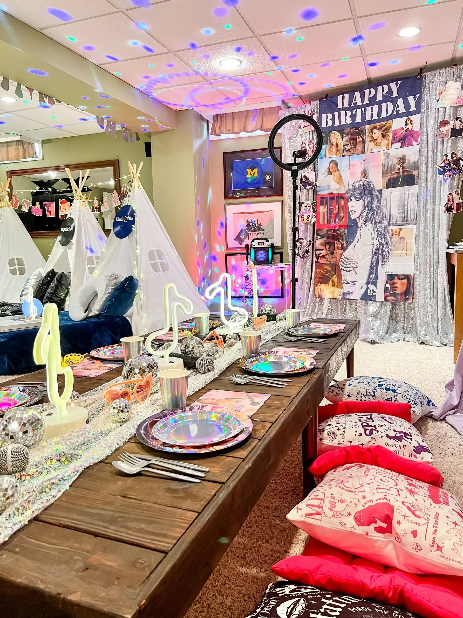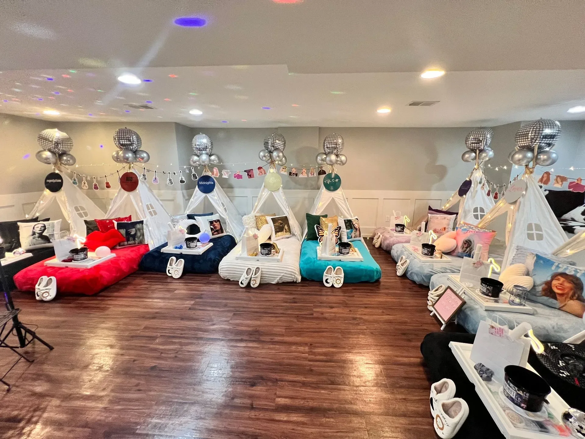 Taylor themed karaoke/selfie station, Polaroid camera and film, Taylor themed picnic, friendship‑bracelet activity, tent toppers for all tents, favour bags containing heart sunnies, disco ball necklace, Taylor stickers, friendship bracelets, glow tubes and personalised VIP passes for all guests.