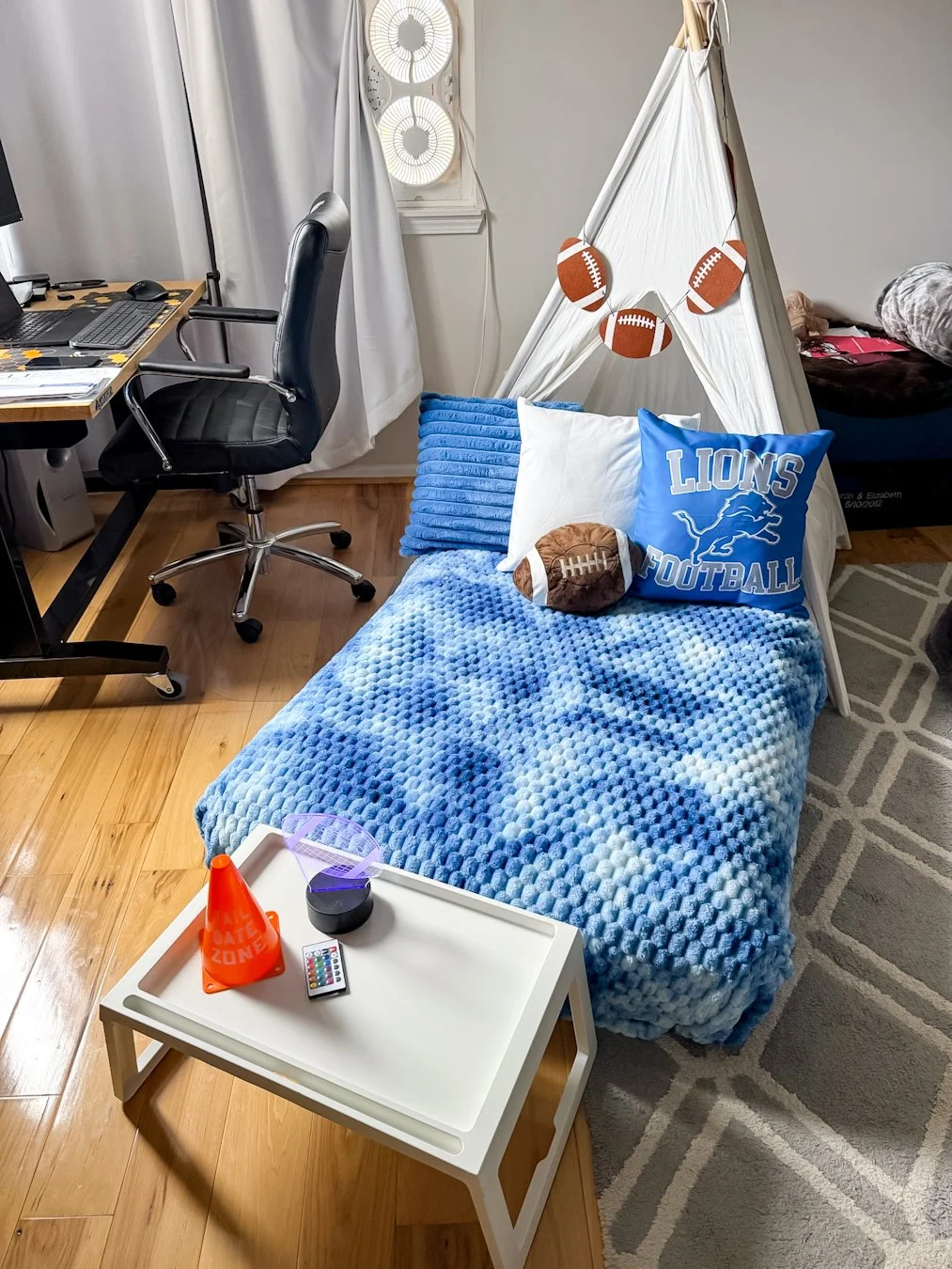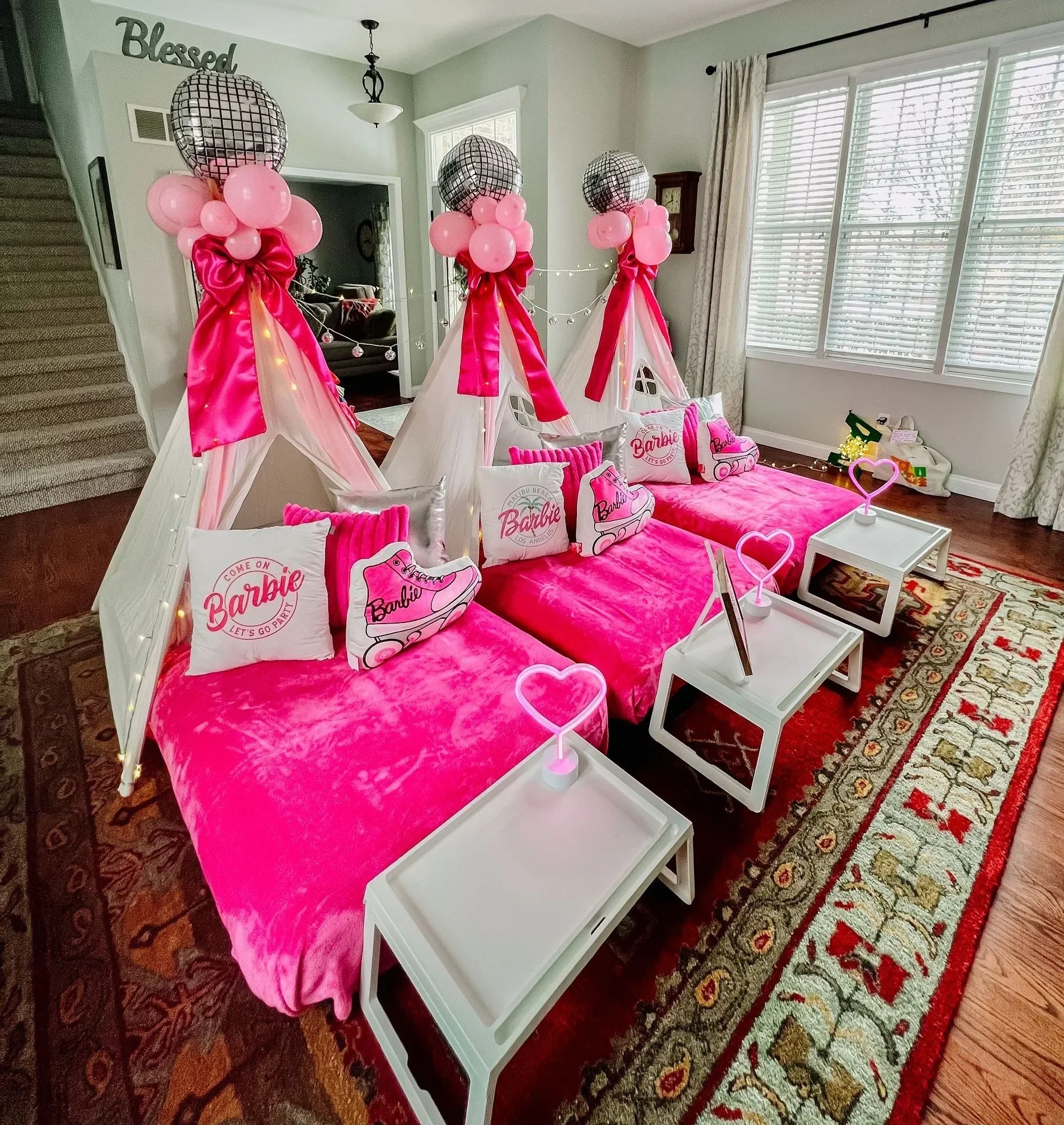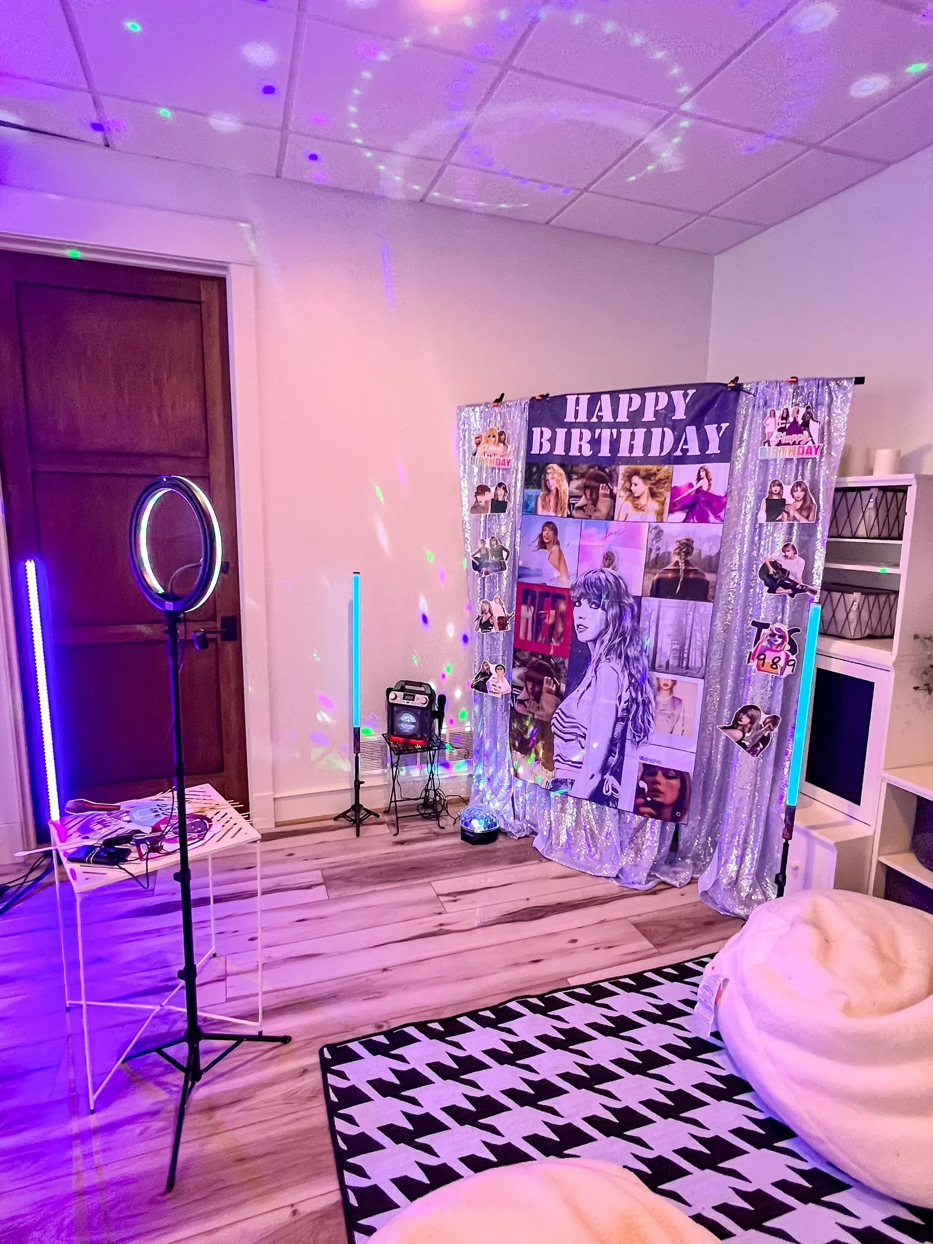 Complete with perfect lighting, karaoke machine, Bluetooth remote with phone stand and disco lights, this is the perfect backdrop for slumber party selfies and sleepover concerts! Pictured: Taylor Swift themed.
