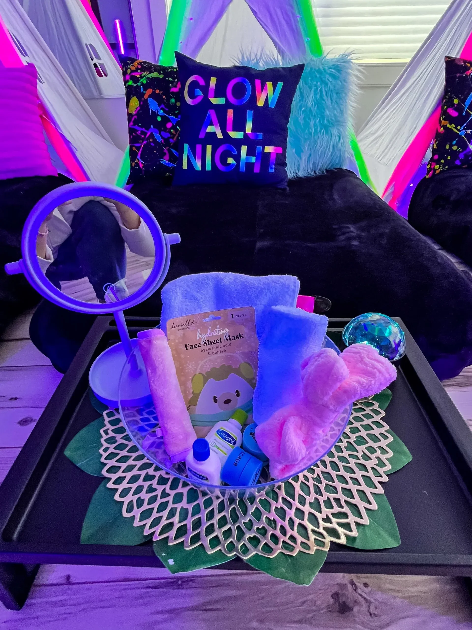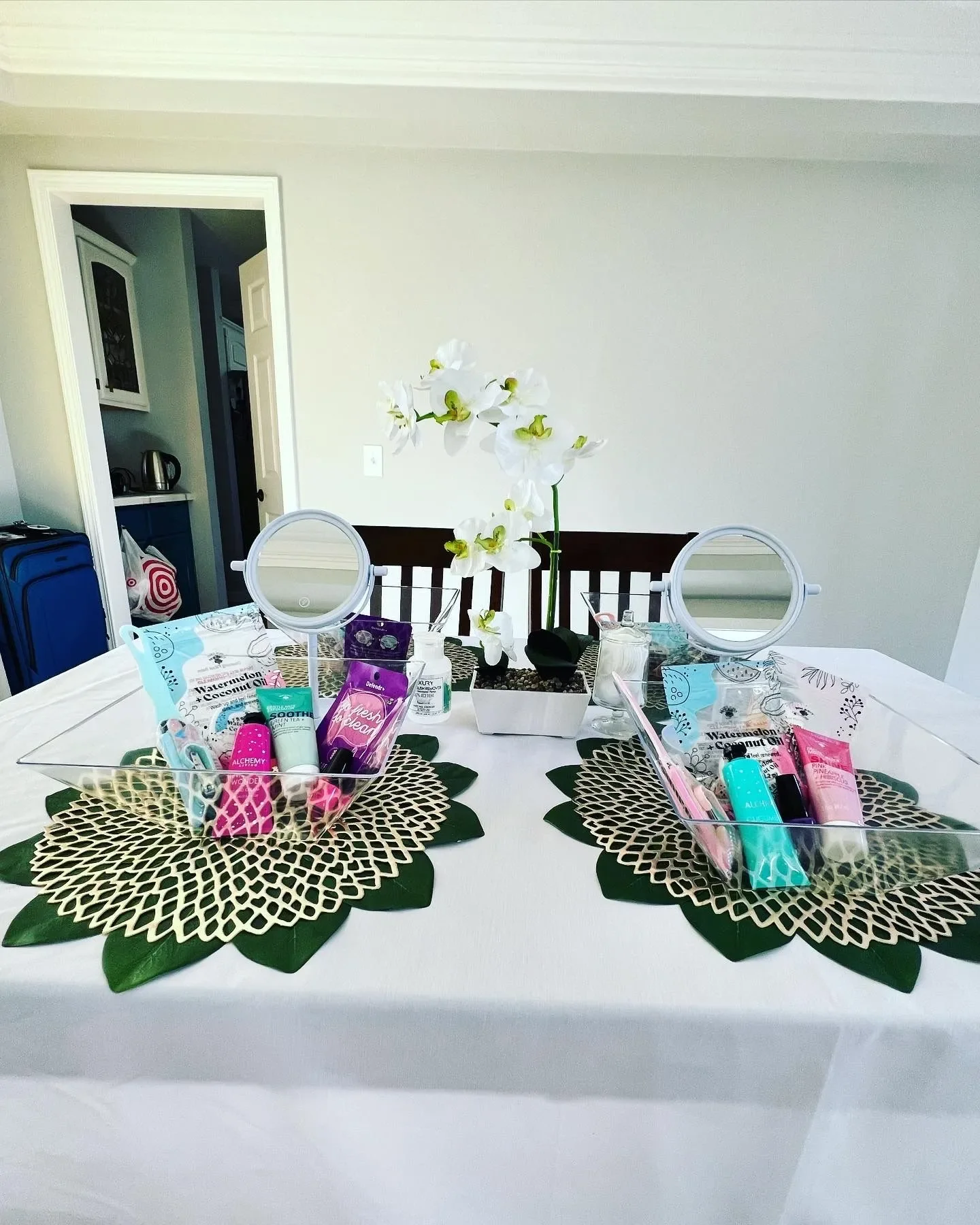 For all guests to keep: hand & foot scrub, nail polish/kit, lotion, facial cleanser or wipes, face mask, face moisturizer in cosmetic bag!
