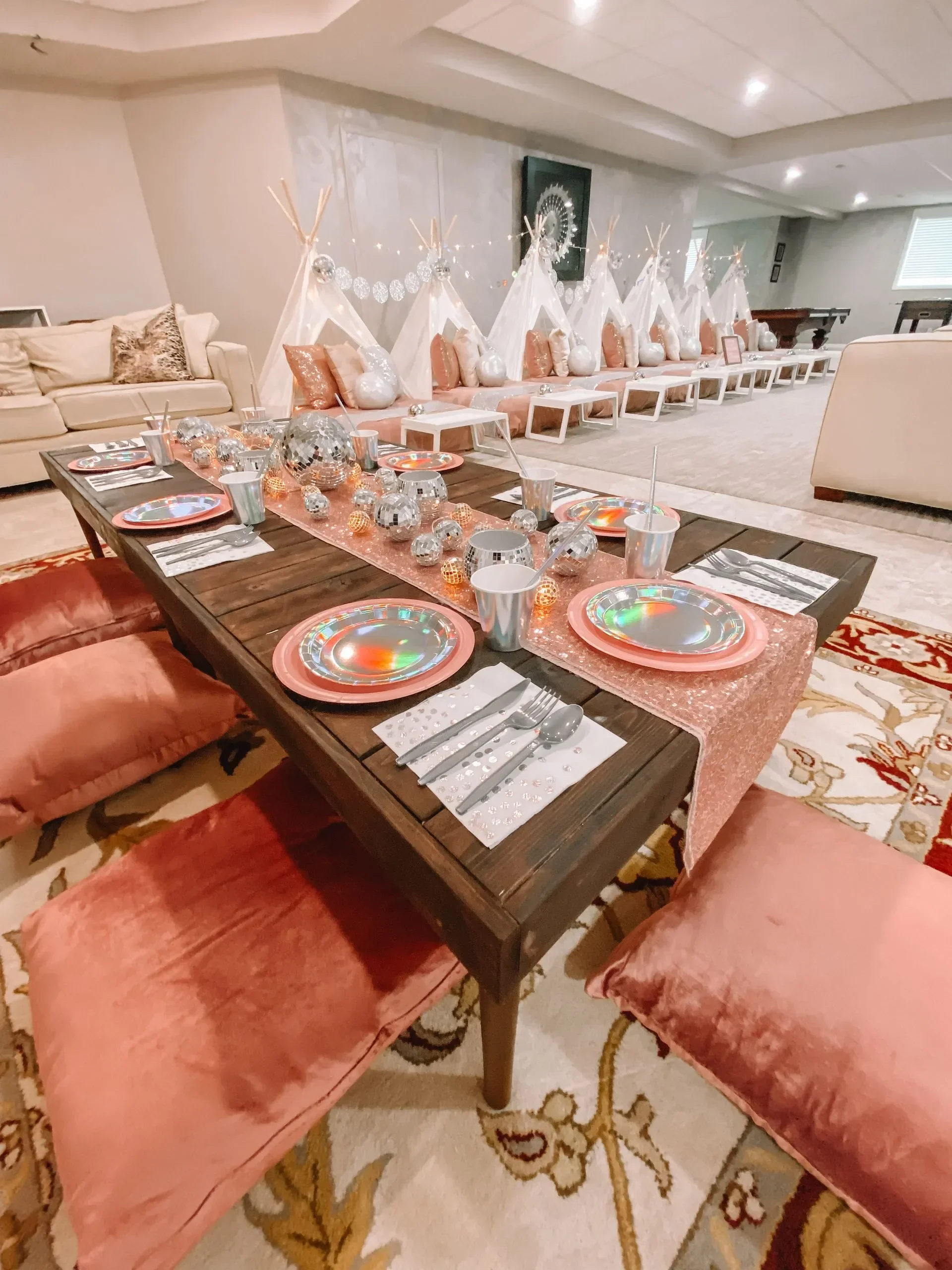 Enjoy your favourite slumber party treats at our low‑profile table, complete with floor cushion seating, decorated and themed tablescape and disposable dishware.