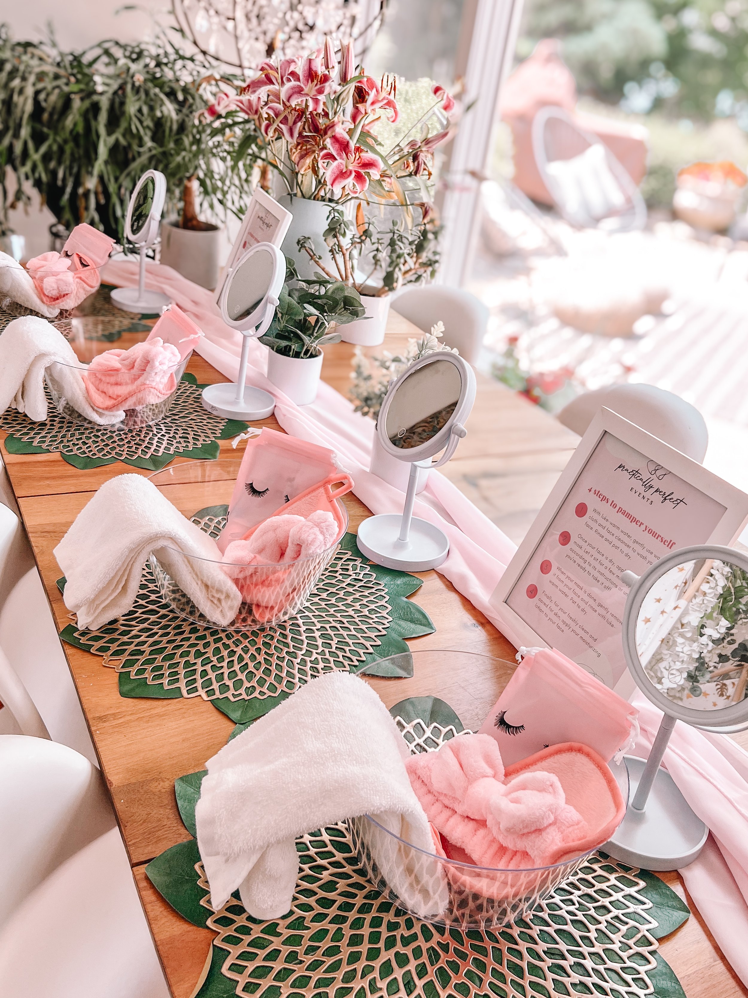 Includes a rented place setting for each guest with a large bowl, professionally laundered fluffy spa towels, mirror, cotton products and decorations. For guests to keep: a gentle skin cleanser, moisturiser, spa headband, face mask and other miscellaneous spa favours (contents may vary). Setup on your table, on trays, or upgrade to our spa picnic!